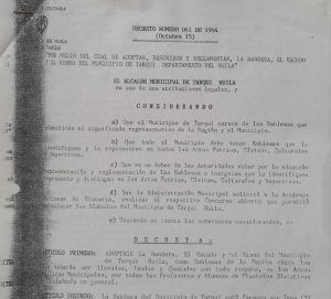 OCTUBRE 15 DE 1994: Por medio del Decreto 061 se adoptan la bandera, escudo e himno del municipio de Tarqui. Octavio Trujillo Castrillón era el alcalde y Joaquín Buendía Perdomo el Secretario General. El autor de la Bandera y el Escudo fue HÉCTOR HERNAN SÁNCHEZ ORTIGOZA. La letra del Himno fue escrita por LEONEL ALVARADO OSORIO y la música fue compuesta por CERVANDO CLAROS MÉNDEZ.