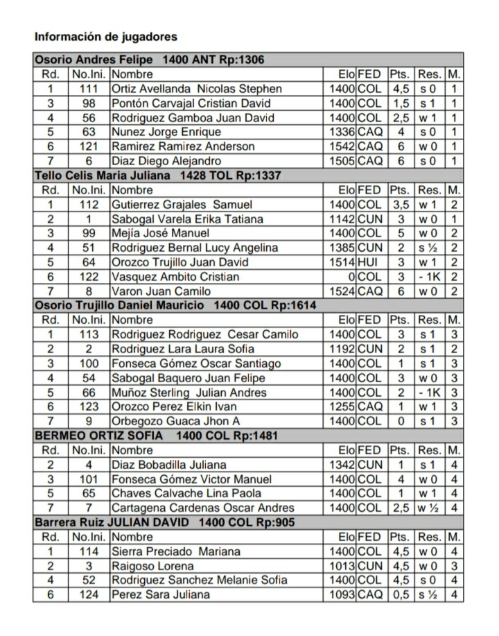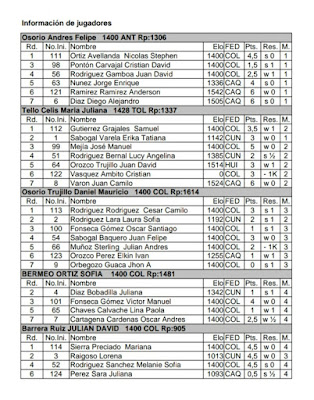 Andrés Felipe Osorio Trujillo: 2 puntos en 6 partidas con un Elo de 1431 puntos.