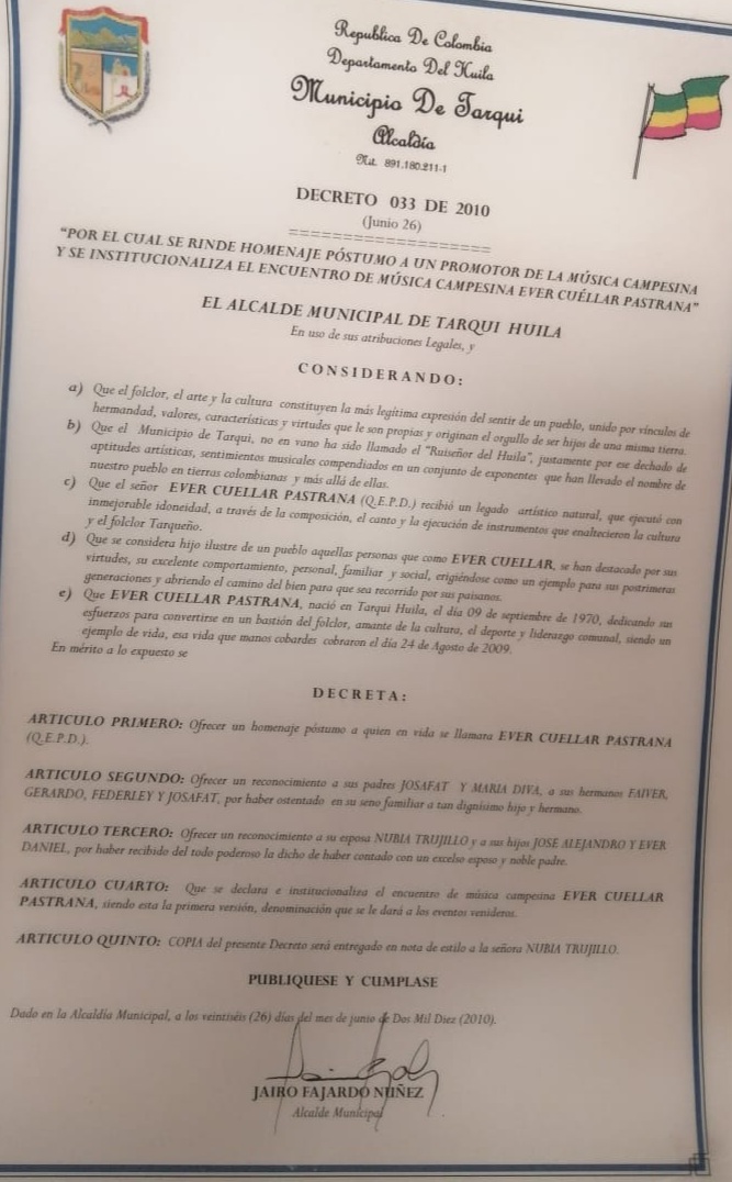 Por todo esto la administración municipal en cabeza del alcalde, Jairo Fajardo, por medio del decreto 033, rindió homenaje póstumo a Ever y se institucionalizó el nombre de este evento como: ENCUENTRO DE MÚSICA CAMPESINA “EVER CUELLAR PASTRANA”. Durante el evento se presentó un video con la vida y obra de este músico y compositor tarqueño, se entregó el decreto del municipio y una placa de parte del Club de Fútbol El Ruiseñor a la familia de Ever Cuellar Pastrana, también una coreografía de una de las canciones compuestas por el extinto músico tarqueño.